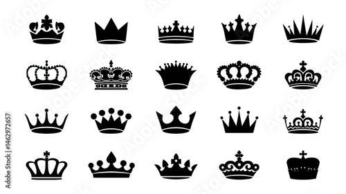 crown, icon, vector, set, symbol, king, vintage, design, royals, label, queen, signs, illustration, heraldic, banner, badge, silhouette, emblem, collection, imperial, element, decoration, retro, heraldry, mediaeval
