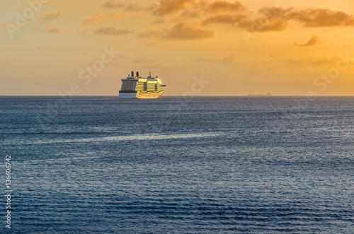 cruise, ship, liner, vessel, luxury, ocean, sea, water, sunset, horizon, caribbean, large, peaceful, paradise, relaxation, gorgeous, impressive, airiness, endless, nature, sky, cloud, summer, sunrise, sunlight, tropical, scenic, destination, vacation, travel, voyage, tour tourism, warm, wave, yellow, blue, light, nautical, sailing, maritime, copy space, freedom