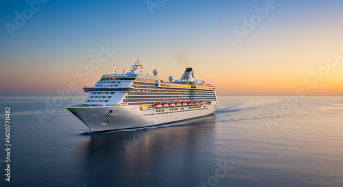 Cruise ship sailing at sea during sunset, a luxury travel vacation and cruise concept for exploration and recreation.