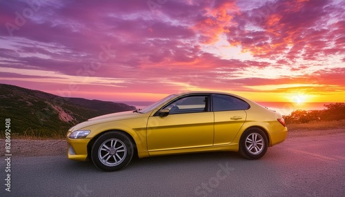 Cruising into Chrome Dreams A Sleek Yellow Car Against a Photorealistic Magenta Sunset