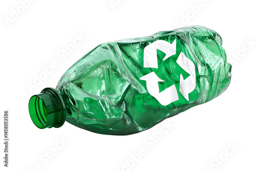 Crumpled green plastic bottle with a white recycling symbol, symbolizing recycling and environmental sustainability