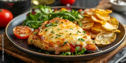 crunchy, chicken, schnitzel, parmigiana, cheesy, melt, chips, salad, delicious, tasty, savoury, crispy, breaded, gold, baked, homemade, comfort, food, italian, fusion, epicure, meal, dinner, lunch, main, course, poultry, meat, cheese, tomatoes, sauce, coating, oven, crisp, juicy, flavorful, seasoned, herb, spice, fresh, vegetable, side, dish, appetising, satisfying, family