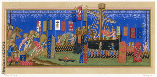 ship, transport, boat, mediaeval, circa, 1100, holy, land, row, shore, sailing, ship, crew, away, cargo, history, historical