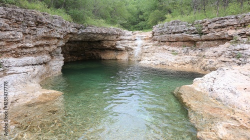 Crystal clear pool in rocky canyon, lush green hills background. Nature travel photography