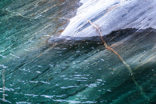 Crystal clear turquoise water of the Verzasca River in the valley of the same name, Ticino, Switzerland. Over the years, the stones in the riverbed have been smoothed.
