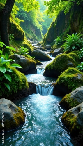 Crystal clear water tumbles down mossy rocks, lush foliage surrounds , vibrant, wild
