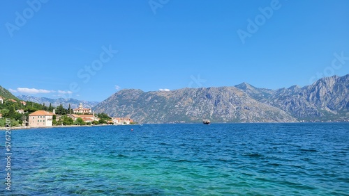 Crystal clear water with mountains in the background in Kotor Bay, Montenegro