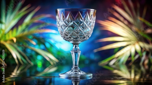glasses, crystal, glassware, goblet, stemware, beverage, cut, etched, transparent, clear, shine, background, white, isolated, studio, lighting, colourful, vibrant, bokeh, blur, tropical, leaf, plant, foliage, dark, night, elegant, luxury, sparkle, pattern, design, texture, object, macro, detail, closeup, sharp, sharpened, photo, image, visual, still life, product, liqueur, wine, cocktail