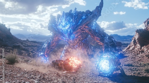 creature, monster, fantasy, science fiction, mystical, magical, power, energy, fire, ice, crystal, stone, rock, desert, landscape, wasteland, mythical, legendary, powerful, majestic, ancient, alien, surreal, dramatic, fierce, intense, threatening, dangerous, attack, battle, fight, destruction, chaos, earth, sky, sun, cloud, dust, heat, cold, blue, orange, red, brown, digital, art, artwork
