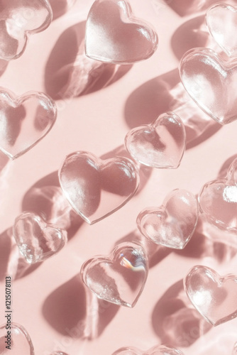 Crystal hearts with rainbow light reflections, ideal for romantic themes or St. Valentines Day background