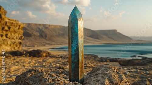 crystal, obelisk, desert, shore, landscape, rock, stone, beach, water, ocean, blue, nature, travel, photo, scene, scenic, beauty, tour tourism, vacation, trip, explore, adventure, geology, mineral, gemstone, amazing, historical building, design, art, view, light, colours, gold, sun, cloud, horizon, sand, sea, still, life, spiritual