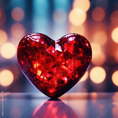 crystal red heart on a background of bokeh lights. romantic card for Valentines Day.