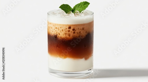 crystal-clear glass of vietnamese iced coffee with condensation droplets, rich coffee layer floating over creamy milk, garnished with mint leaf, clean white backdrop