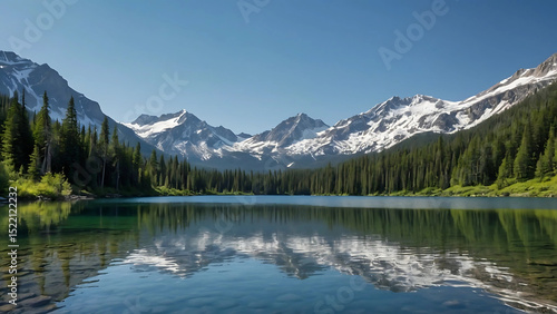 lake, mountain, snow, tree, evergreen, pine, water, crystal, clear, tranquil, peaceful, serene, nature, landscape, blue, sky, symmetric, photorealistic, scenery, calm, mirror, wilderness, outdoors, environment, beauty, winter, still, forest, majestic, pristine, horizon, alpine, ice, quiet, fresh, clean, real, symmetry, scenic, cool, untouched, mood, sharp