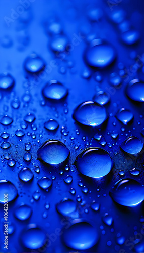 Crystal-clear water drops resting on a vibrant, dark surface with a dewy background, capturing nature’s serene beauty and texture