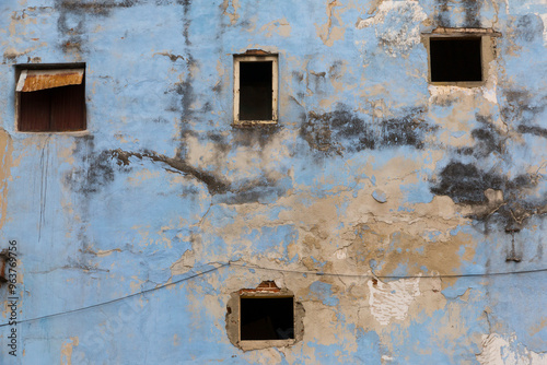 Cuba, Havana, old Havana wall, peeling blue paint. Vacant windows. 2016-03-25