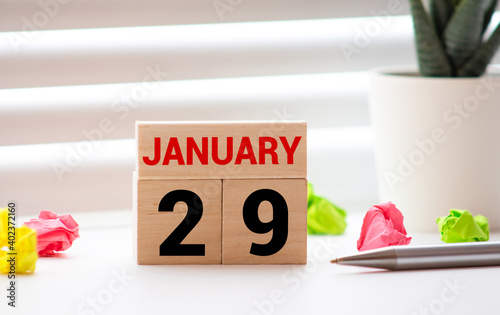 Cube shape calendar for January 29 on wooden surface with empty space for text.