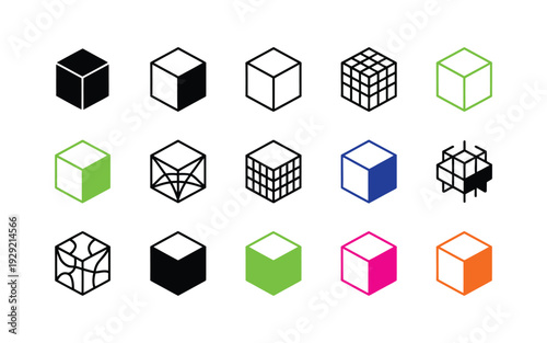 Cube vector icons in various styles and designs on a plain background