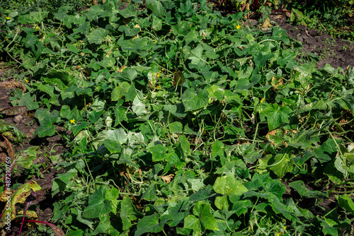 cucumber seedlings grow in the vegetable garden