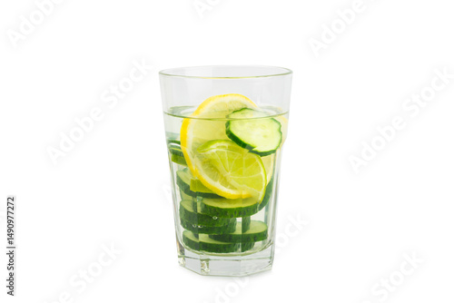Cucumber water with lemon, lime and mint isolated on white background. Water infused with sliced ​​cucumber in a drinking glass. Tonic refreshing drink. Cucumber lemonade.Summer natural cooling drink
