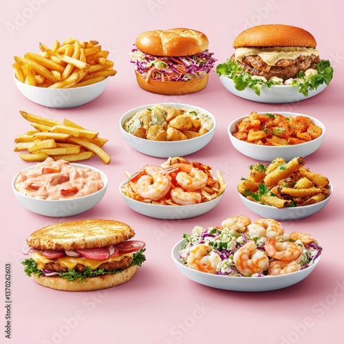 Culinary Collection, An Array of Delicious Burgers, Fries, and Shrimp Bowls