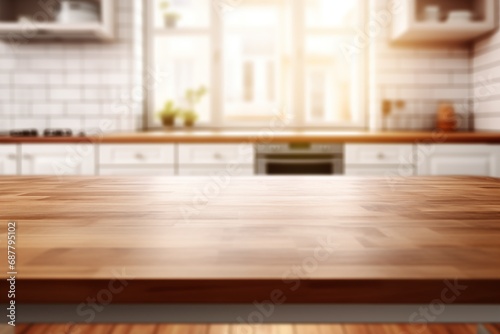 Culinary Haven: Neat Wooden Table Set Against a Softly Blurred Kitchen. Generative AI