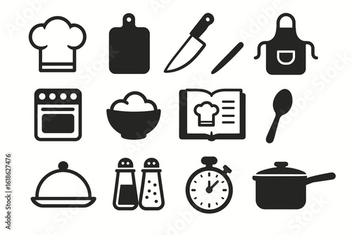 culinary, chef, hat, knife, cutting, board, cookbook, oven, utensil, bowl, apron, spoon, timer, saucepan, dish, ingredient, cooking, kitchen, tool, symbol, icon, black, white, preparation, food, meal, equipment, bake, salt, pepper, vector, icon