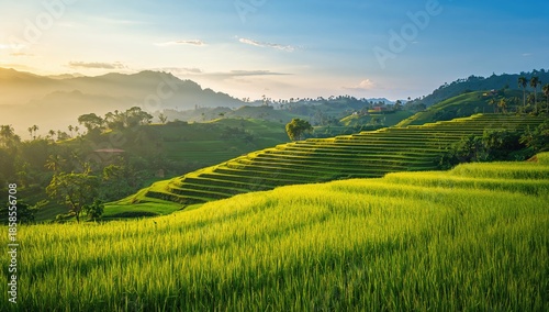 Cultivated rice paddies with surrounding hills, serving as a background for agricultural or environmental themes