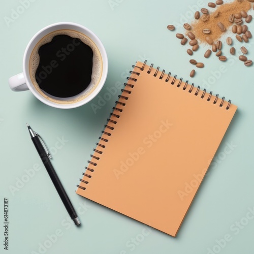 Cup of coffee and notebook with write to do list on pastel background. Generative Ai.