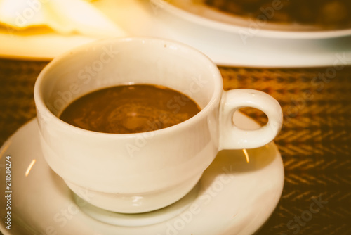 Cup of coffee on wood table background with vintage retro tone. Abstract blur coffee shop and restaurant interior for background. Cup of latte or cappuccino with a bread in coffee shop.