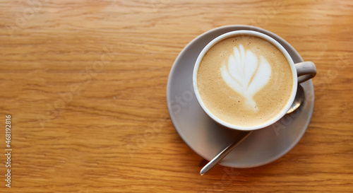 Cup of coffee on wooden table in cafe. Cappuccino or latte in mug. Enjoying time alone