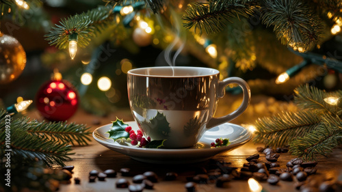 cup, hot drink, drink, tea, beverage, hot, christmas, mug, food, saucer, table, breakfast, spoon, espresso, cafes, plate, holiday, decoration, chocolate, milk, caffeine, brown, black, ai, background, christmas tree, light, atmosphere, relaxing, new year, illustration