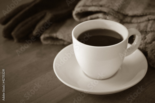 Cup of coffee with blurred background of a scarf and gloves on wood table. Copy space is on the left side.