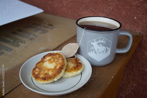 food, breakfast, tea, battercake, cup, sweet, hot drink, plate, drink, dessert, white, snack, pastry, delicious, baked, meal, cheese, tasty, hot, beverage, morning, lunch, cafes