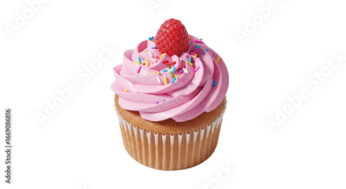 Cupcake is adorned with pink frosting, sprinkles, and a raspberry, displayed against a isolated background.