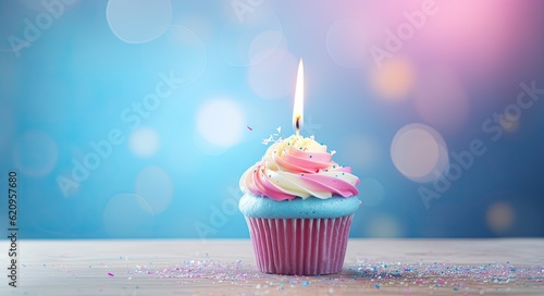 Cupcake with candle on blue bokeh background. Birthday concept