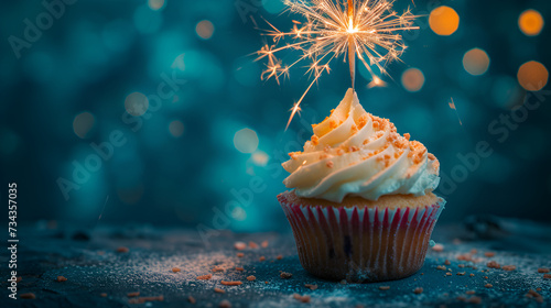 Cupcake with sparkler Illustration ,delicious birthday cake with blue background