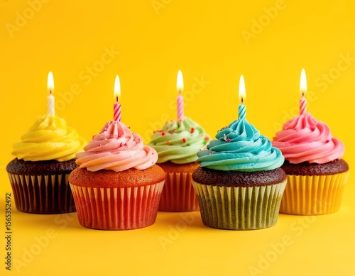 cupcakes with candles on yellow background.