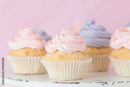 Cupcakes with pink and violet buttercream standing on pastel pink background.