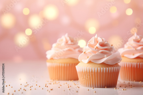 Cupcakes with pink frosting on a peach bokeh background. Festive image for bakery's advertisement or children's birthday party service. Design for a cafe or dessert shop. Banner with copy space