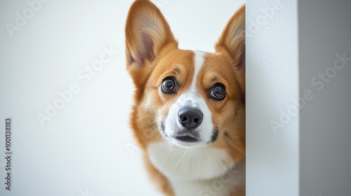 Curious Corgi peeking from behind a white wall, with a focus on its adorable expression and contrasting colors.
