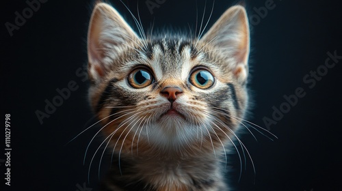Curious domestic black tabby kitten portrait with expressive eyes against dark background in a studio setting showcasing its beauty and charm