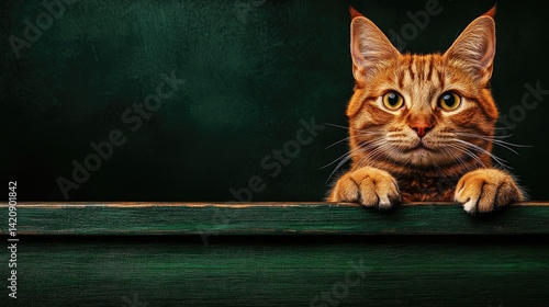 Curious ginger cat peering over a dark green wooden ledge