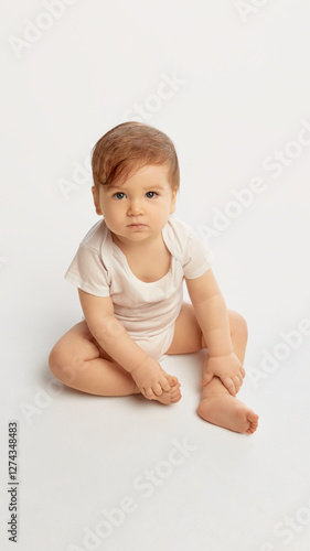Curious little baby wearing white onesie sitting on floor holding tiny foot while gazing forward against white studio background. Concept of childhood, growth, exploration, natural curiosity.