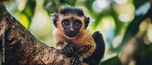 Curious monkey perched on tree branch, surrounded by lush greenery, showcasing its expressive eyes and playful demeanor