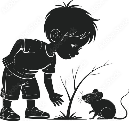 boy, mouse, children, nature, animal, wildlife, plant, curiosity, innocence, children, outdoors, discovery, encounter, silhouette, illustration, young boy, cute child, summer day