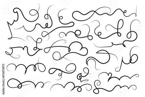 Curly swirl decorative swishes, Hand drawn calligraphy lettering ornate strokes, flourish swirling squiggle Highlight Swoosh typography text elements. Pen Filigree flourishes vintage scrolls