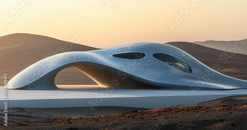 futuristic, architecture, building, desert, sand, landscape, modern, design, curve, white, smooth, structure, contemporary, exterior, outdoors, nobody, sky, sunlight, abstract, organic, innovation, minimalism, clean, technology, travel, arid, environment, scenic, horizon, perspective, surreal, aethereal, alien, unique, dreamlike, artistic, creative, illustration, rendering, form, fluid, light, shadow, texture, pattern, surface, open
