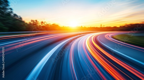 Curving Highway with Light Trails at Sunset, Transportation Background. Speed and Motion Concept.
