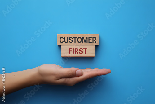 "Customer First" Visual Concept on Wooden Blocks for Illustration. Minimalist Wooden Blocks Composition.